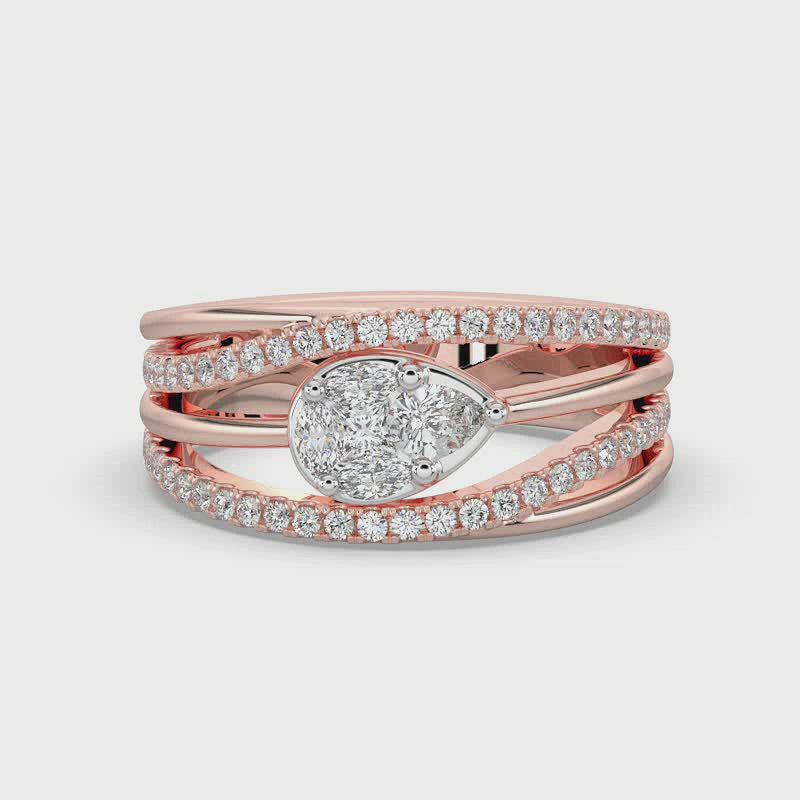 Embrace a modern symbol of unity and elegance with our exquisite Diamond Crossover Ring. Expertly crafted in radiant 18kt Rose Gold, this stunning ring features two graceful bands that beautifully intertwine, each adorned with a continuous line of brilliant pave-set diamonds. At the heart of this captivating design, a magnificent pear-shaped diamond is securely nestled, creating a focal point of exceptional sparkle and sophistication.